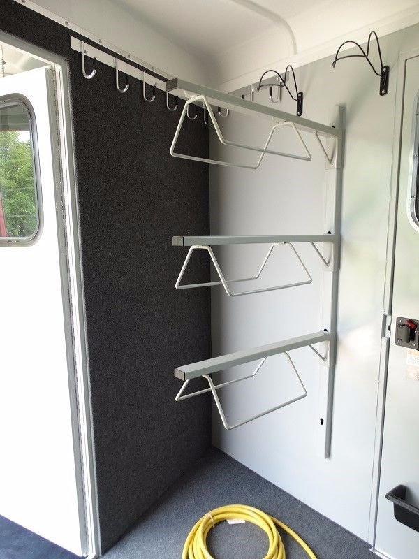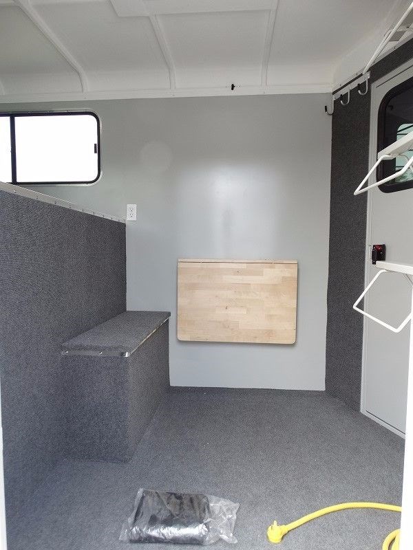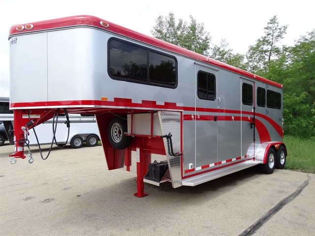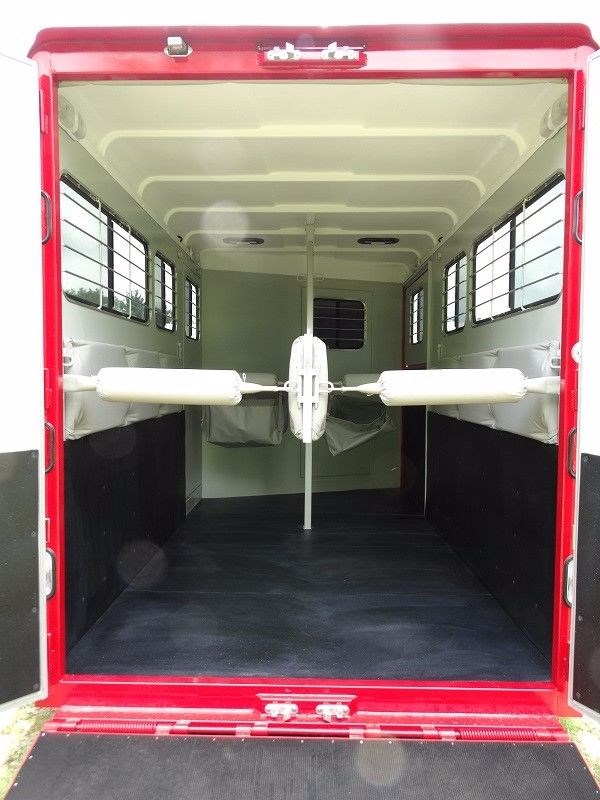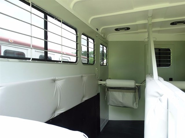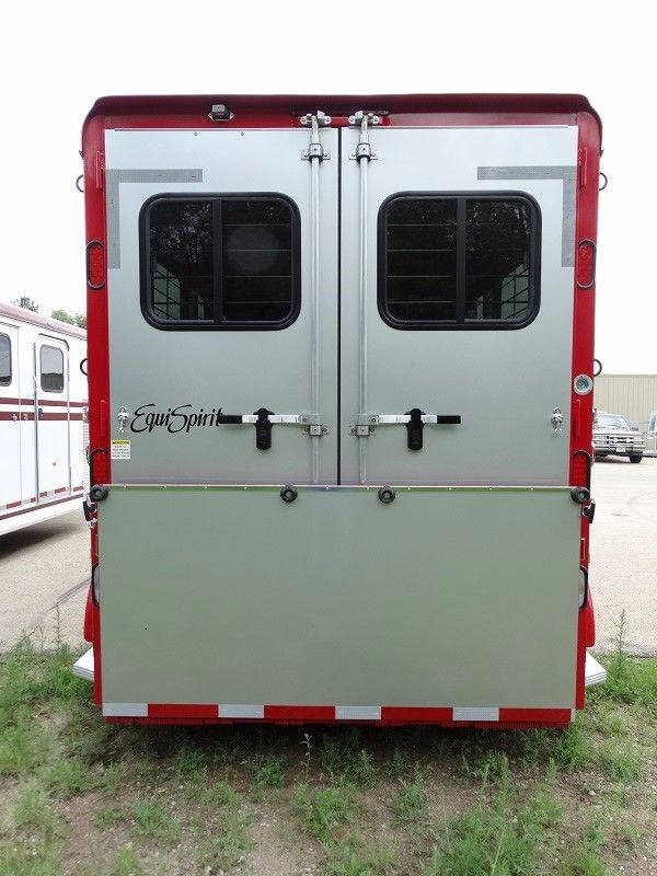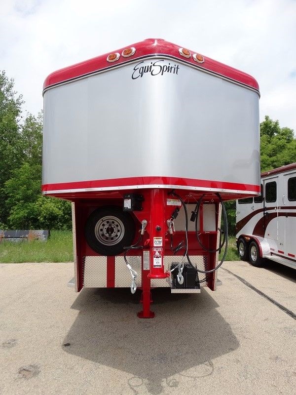 2016 EquiSpirit 2 Horse Walk Through Gooseneck w/ Side Ramp Structural, 29' 6" overall legnth, 22' body legnth, Rear Stalls: 7' stall, 3' 6" head area, Gatorshield Galvanized frame, 2' x 8' pressure treated lifetime warranty pine floor, 16" and 24"on center steel Galvanized cross brackets supporting floor, Seamless no leak molded one piece fiberglass roof, Rubber lining on interior horse walls, Galvanized bulkhead wall with opening window, Raised dressing room floor (no lip) for easy sweeping, Galvanized removable swinging horse/shoulder divider, Removable front center post in rear stalls, Solid removable swinging head divider, Quick release padded butt/breast bars, (2) dual opening alum roof vents � (1) over each horse head area, Full aluminum running boards, 1� Styrofoam insulation between walls throughout trailer, Side unload ramp with upper door and 20" x 24" window and 2pt safety latch Jack/Coupler, Adjustable height Fulton cable release 2 5/16", Single speed single leg jack Axle and Tire Info, Two 5,200 lbs. rubber torsion axles with electric brakes on both axles, Self adjusting brakes, Upgraded ST22575R15(D)tires, Aluminum rims, Spare tire mounted under gooseneck Doors, 30" dress door with 20 x 24" window, Full height rear doors with 20 x 24" sliding windows and screens, 48" low incline ramp over full height rear doors, 48" side ramp with upper storm door with window, Lifetime warranty marine grade plywood in ramps, (1) 30" side walk thru door with exterior butterfly safety latches on road side horse area Exterior, Durable, easy to replace, non-rust rubber ramp latches, Rear ramp safety latch, (4) exterior tie rings � (2) over each fender for horse tie and hay bag, (8) LED turn signal/brake lights � (3) sets in rear (low and middle and high) and one on each fender, 14 LED running lights to exceed DOT requirements, Set of back up lights, Chrome light guards on all running lights, Break-a-way battery mounted inside dressing area on DS nose wall, Full running boards Interior, Padded butt and breast bars, 2"foam and vinyl padded side walls and center divider, Ditch side stall latch to attach rear center divider to move out of way, Rear header pad mounted in the interior over the top rear doors, (3) interior lay flat tie rings per horse, (2) square vinyl feed bags,(1) per horse, Carpet on dressing room floor and bulkhead dressing room wall, Large brush tray mounted on interior of dressing room door, (4) dome lights in horse area and (2) in dressing room gooseneck area, Exterior remote master switch for interior lights, Exterior remote master switch for dressing room lights, Rubber floor mats covering entire horse area, (6) interior bridle hooks in dressing room, (2) special wire saddle racks in dressing room with adjustable placement, (2) helmet racks, Lifetime warranty on wood floor in horse area, Lifetime warranty on marine grade plywood in ramp(s), 8-Year structural warranty, 3 year bumper to hitch warranty ADDITIONAL OPTIONS: Add additional footage to dressing room - Add additional footage to horse head area Add (2) saddle racks for a total of 4 Bridle hooks in addition to standard for a total of (12) Gooseneck storage bin step 110 volt electrical system breaker box, cable, 2 interior outlets, & light. Dome vent with screen and fan Air conditioner ready 30 gallon exterior water tank under gooseneck Flip up table - Bulkhead door - Solar panel to charge 12v battery Outside tie rings - add (2) sets of tie rings for horse and hay bags near rear of trailer