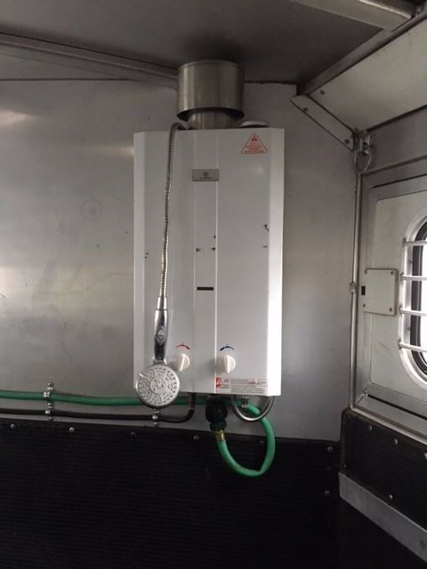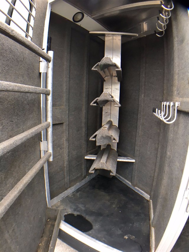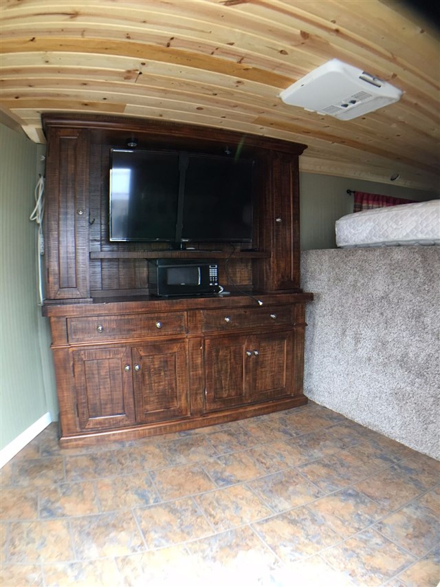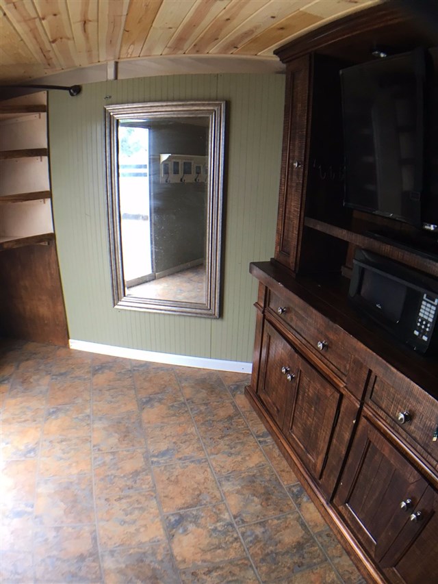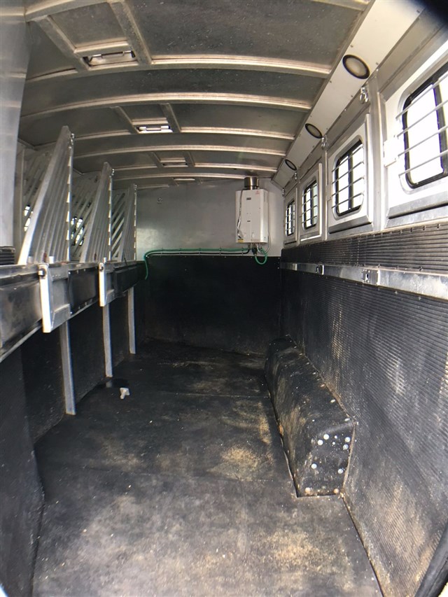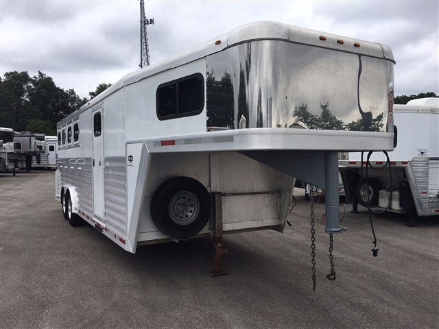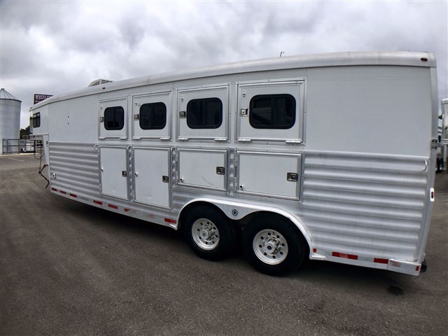 2004 Bloomer 4 Horse trailer 7'SW Dressing Room, Trailer Specs, 23' floor length x 8' wide 7' Tall, Stainless nose cap, Dressing Room, Nicely Finished out, 46" Samsung TV, Vinyl Floor/ Carpeted Bed Area/ Bead Board on Walls/ Wood ceiling, AC with Heat Strip, Cloths Rod and Shelves, Large Cabinet, Horse Compartment: Mangers, Water heater with Cowboy shower, 3 dome lights, Dividers, Drop down windows head and hip, tack, Carpeted, 4 Tier Saddle rack, 4 Tier Swinging, Blanket bar on door, 1 Brush Tray, Dome Light, Load light, 10 Bridle hhoks, Wheels, Tires & Axles, Tandem 7K Rubber torsion axles, 16" Alcoa Aluminum, Electric/Hydraulic Brakes. Like new 14 Ply Hankook tires.