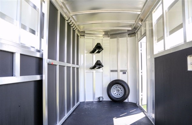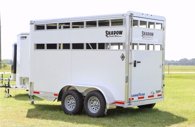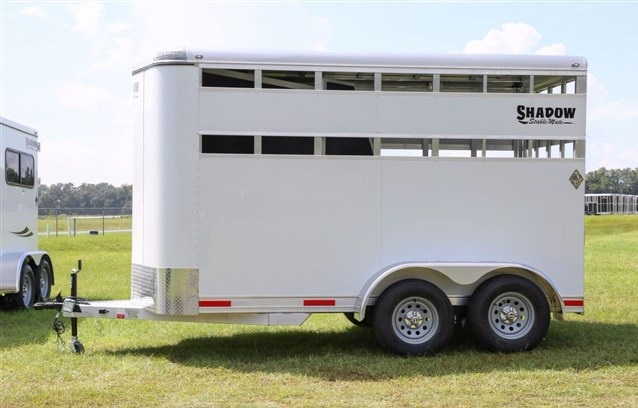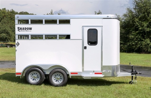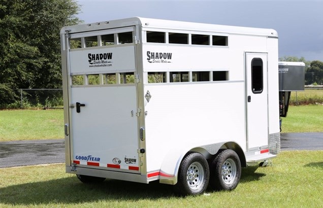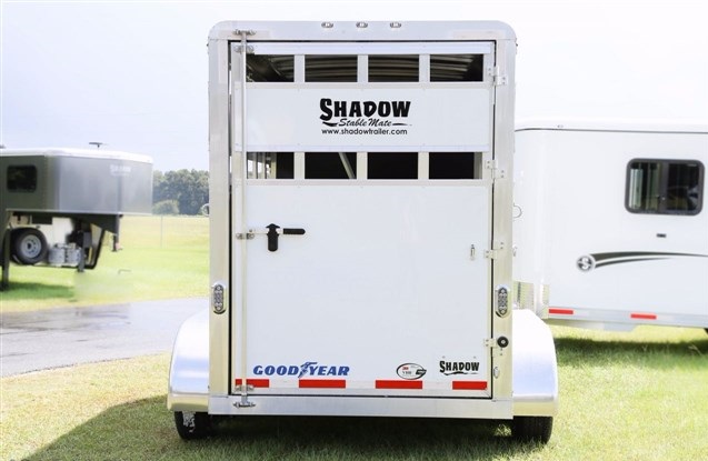 2017 Shadow 2 Horse Bumper Pull, 13' 6' Floor 15' 6' OAL. 6' Wide, 7' 6' Tall. Slant Load, STOCK SIDES., DRIVE TRAIN: Spring Leaf Axles, Includes spare, DRESS: 24' Short Wall. Dress Door w/ Window. Swinging Slant Wall. Saddle Rack Mounts, Bridle Hooks, Dome Light. Spare Tire Mount., HORSE AREA: 42' Stall Width. Lined Lower Walls, Aluminum Stall Divider w/ Rumber Lining, Dome Light. *PRESSURE TREATED LUMBER FLOOR with Rubber Mats. Full Height/Width Hinged Rear Door w/ Stainless Latch, Weight: 2200LBS, White Exterior Sheeting with Aluminum Roof, Goodyear Tires