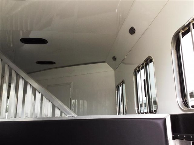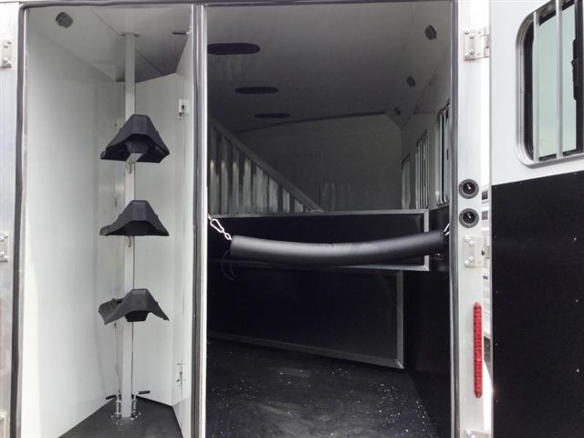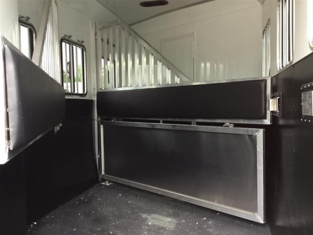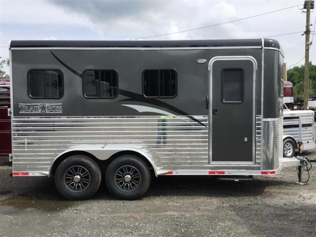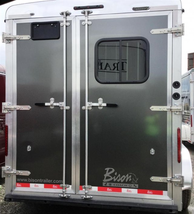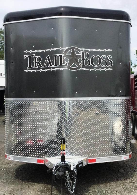 2016 Bison Trail Boss 7300BP 3 Horse Bumper Pull. 7' wide,7'5" interior height, 6000# spring axles with equa-flex trail air, 15"x5 lug-e tires, spare tire and wheel, breakaway safety with battery and trickle charger, led lights, full width rear rubber bumper, window in right rear door, 10 bridal hooks and brush tray, entrance door with separate screen door, crank up vent in dressing room, pop up vent per horse stall, rear loading light, porch light, interior dressing light, interior horse lights, rubber mats, removable padded dividers, drop down feed windows, saddle rack in dressing room, stud wall, rear tack room, atp running boards/fender support, pull out alum step at camper door, walk thru door to horse area, led lighting marker and taillights, thoroughbred aluminum wheels.