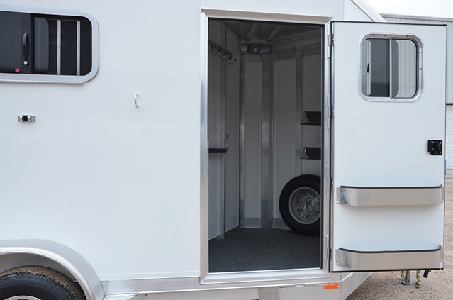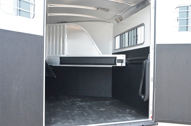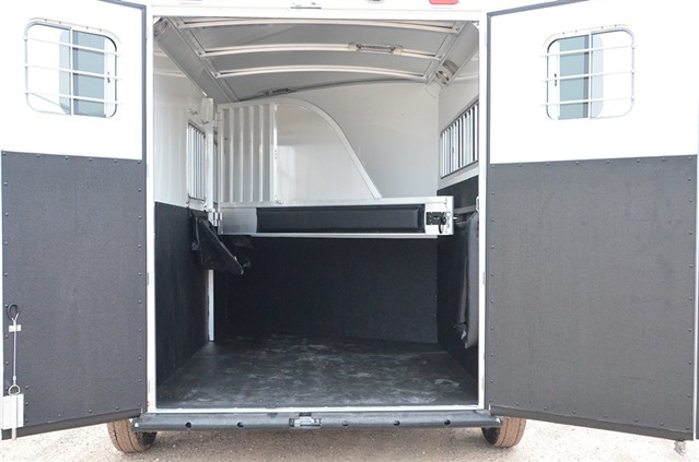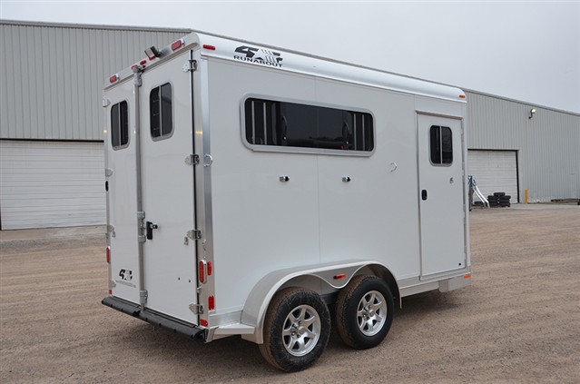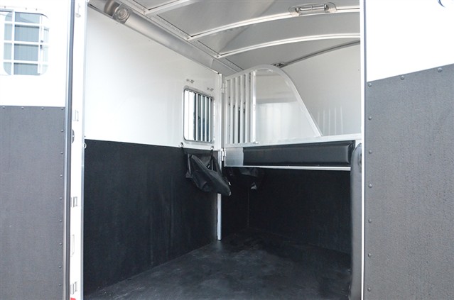 2016 4-Star Runabout 2 Horse trailer, Slant load, BP, all aluminum, 7'6 Tall (not the standard 7' tall), 12' long (easy to pull),dr rm with locking door, drop windows with bars on the head, roof vents, larger sliding window on hip side that also is a drop down for extra airflow, alum floor, mats, padded divider, saddle racks in dr rm, 2 inside/outside horse ties, feed bag for each horse, loading light, LED lighting. This isn't your typical runabout model as we have added some great options: spare tire 7'6 tall extra foot added to the dr rm large drop down window on the butt side instead of the small sliding windows trailer is white.
