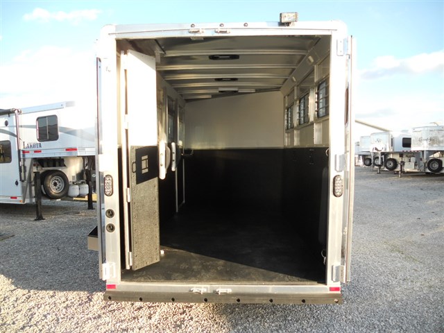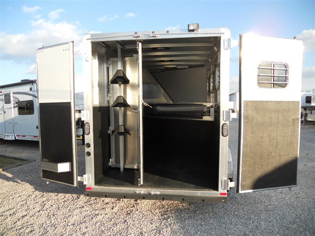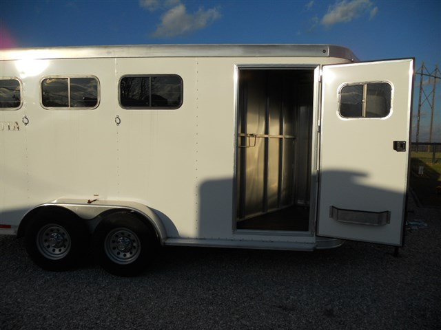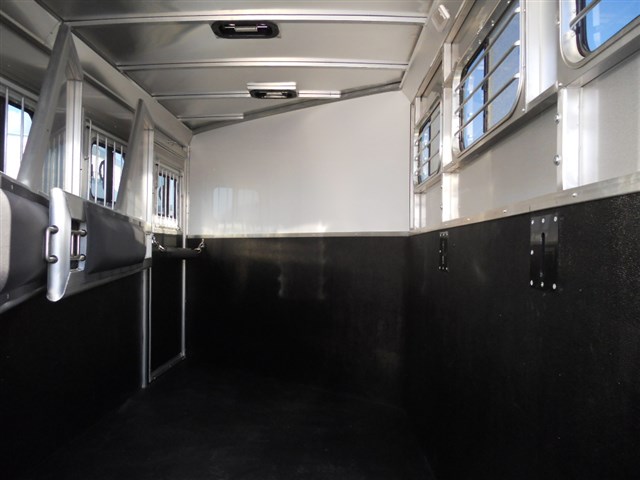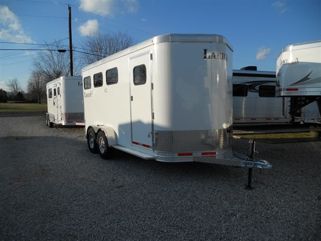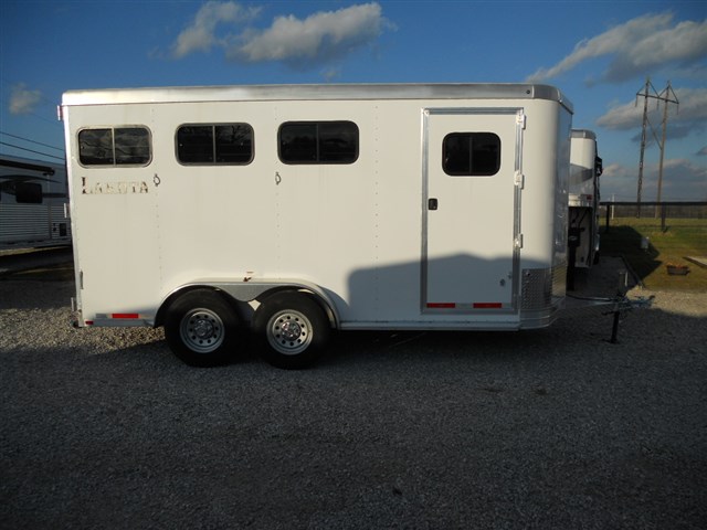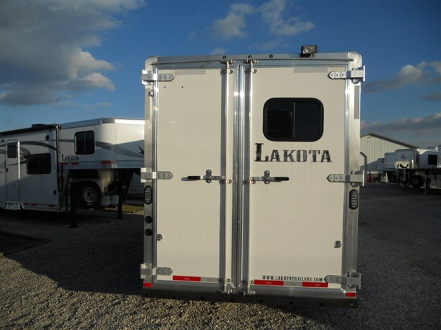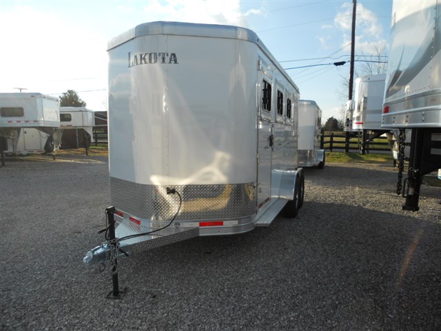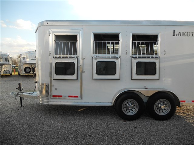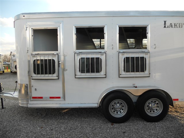 2016 Lakota 3 Horse trailer, Bumper pull Slant Load, All Aluminum, 17'6" Long x 6'9" Wide x 7'6" Tall, Drop down feed door with separate drop down window bars at head of each horse. Sliding window at rear of each horse. Collapsible rear tack room. 2-Way roof vent for each horse. Dressing room door with window. 14" x 14" Crank up roof vent in dressing room ceiling. 3 Adjustable saddle racks. Brush tray. Bridle hooks. Blanket bar. Spare tire.