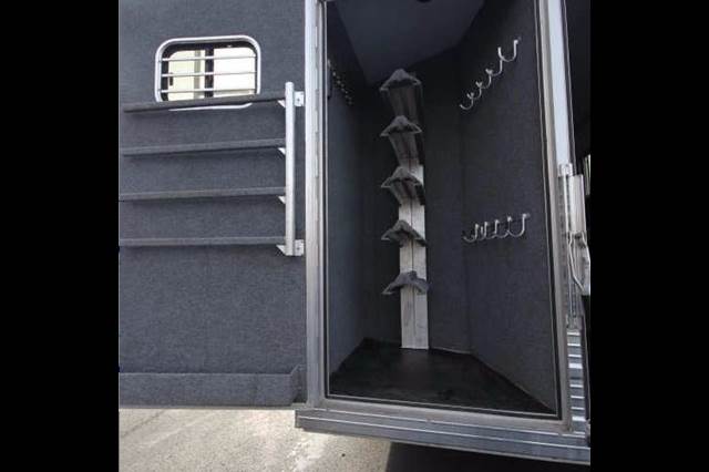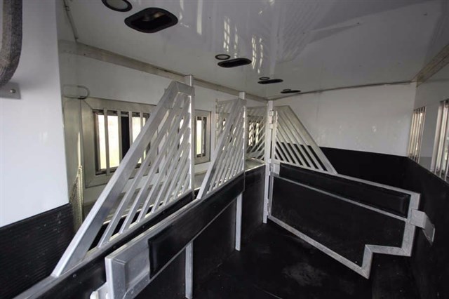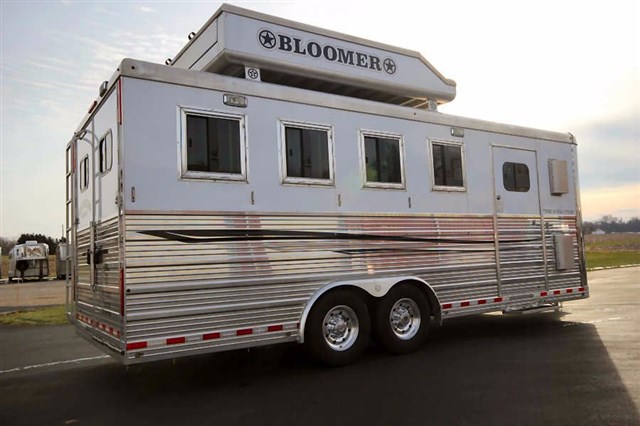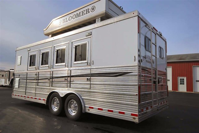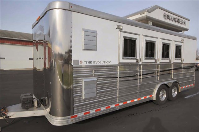 2010 Bloomer 4 Horse Slant Load Bumper Pull with Dressing room, All aluminum, 22ft box, 8ft wide, 7ft 6in tall. Very large front dress area, 4' short wall, 8' long wall. 6 vents in dress area, 3 large storage boxes, 26 bridle hooks, clothes rod, lunar dome vent, lights on battery switch and rubber mats on the floor. The dress area is fully insulated including the roof. fold out step at dress area door. Horse area is fully rubber lined, fully padded and fully insulated. drop down doors with bars, bloomers full swing feed door at each horses head, drops with bars on butt side. 4 mangers with 4 manger access doors, 8ft enclosed hay pod, fixed rear tack with 5 saddle racks, 16 bridle hooks, 4 swing out blanket bars, and 1 brush tray. stud divider 1st stall. Alcoa wheels with 14ply tires. electric/ hydraulic disc brakes. spare tire included. 5 load lights located on all sides of trailer. this is a clean used trailer but it is still a used trailer