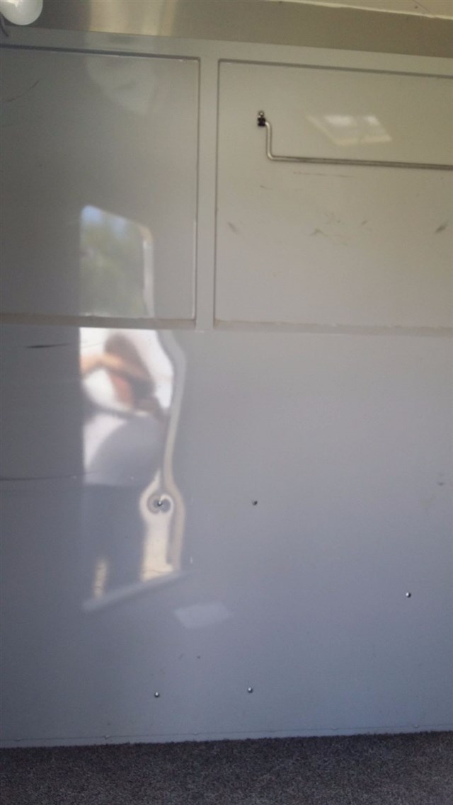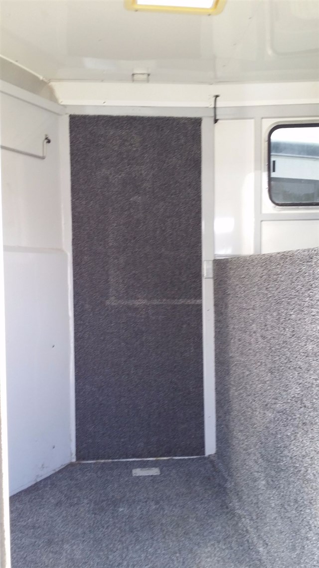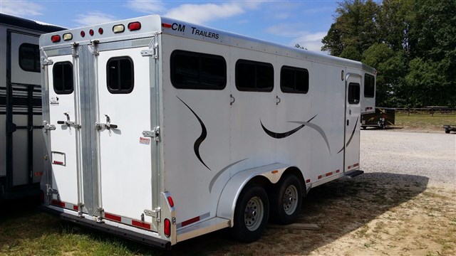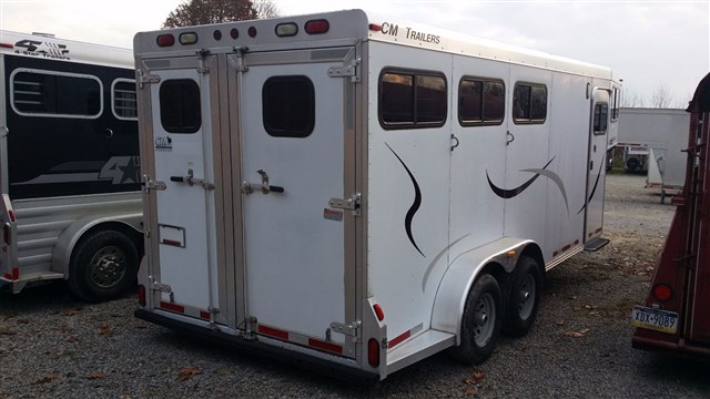 2003 CM 3 horse gooseneck. This trailer is white and has a walk out door at the first horse, drop down feed doors at all 3 horses heads, sliding windows at each horses hip, the roof in the dressing room is lined and insulated, folding rear tack with 3 saddle racks on a removeable post.