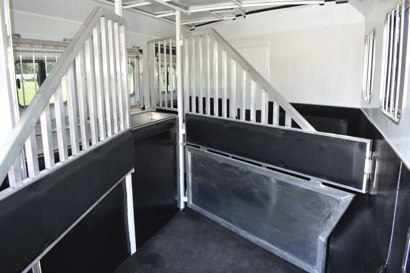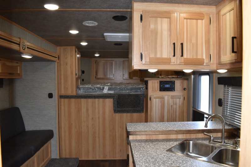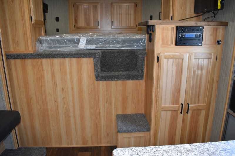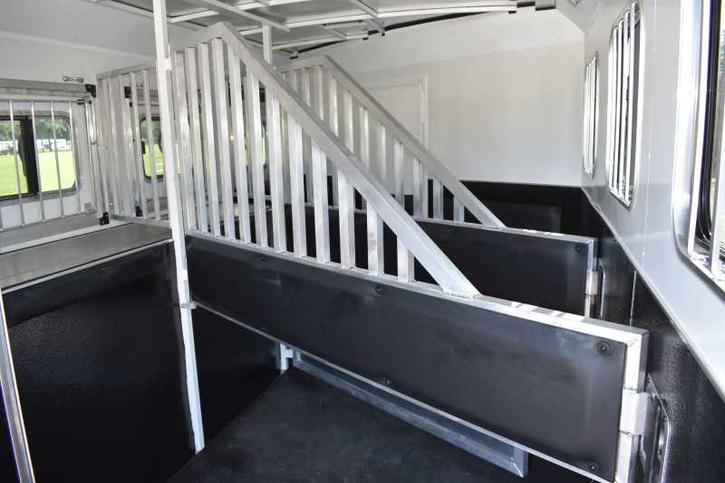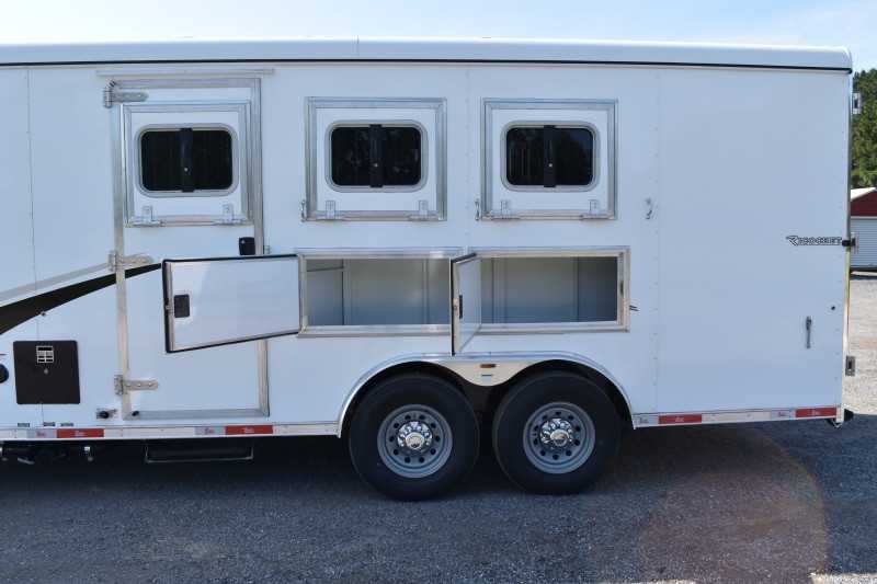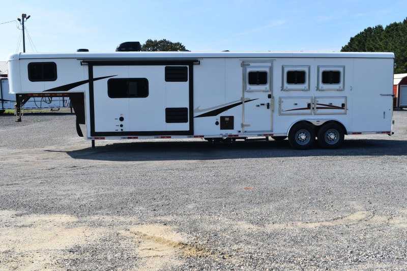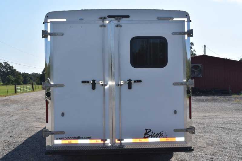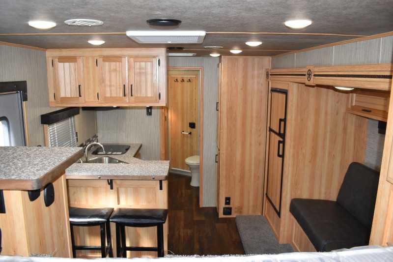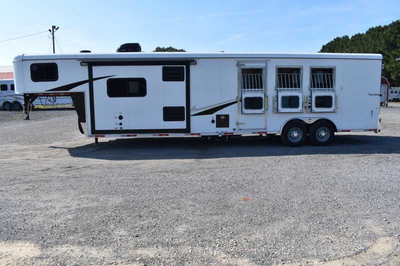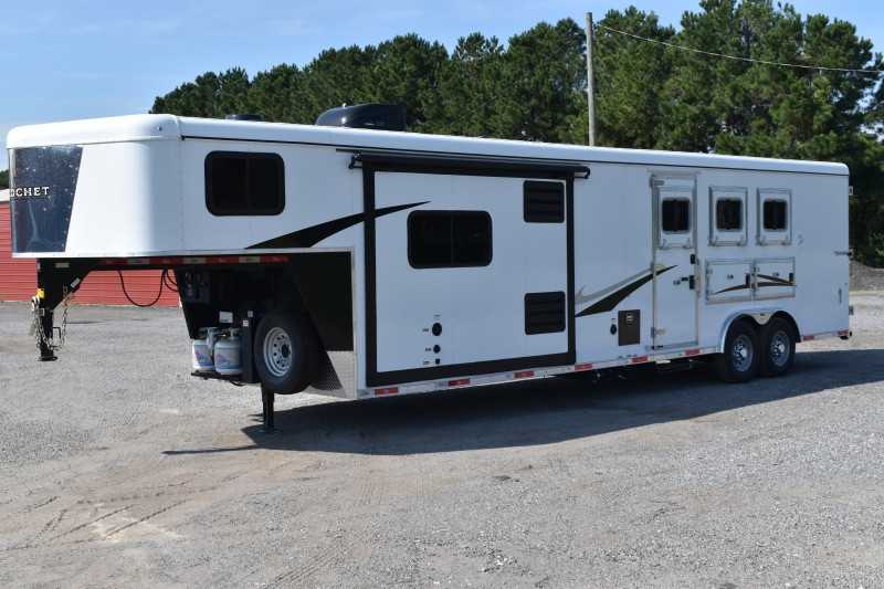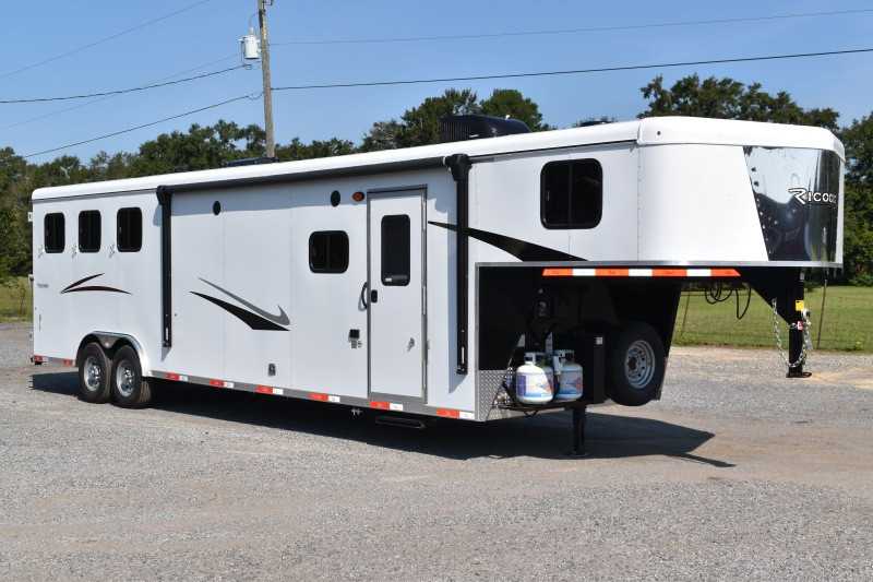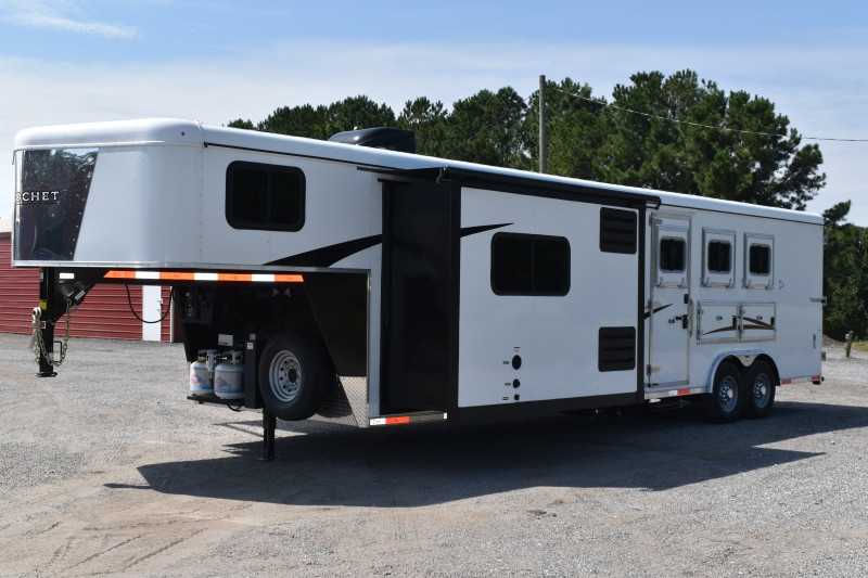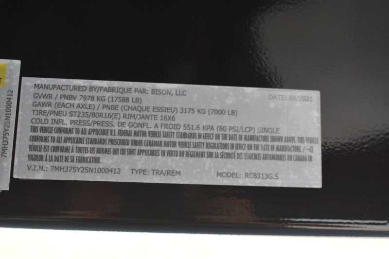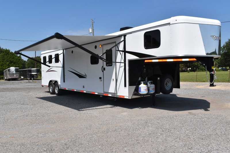 2022 Bison Ricochet 8313GBSO, ELECTRIC AWN! HYD JACK! LIFETIME FLOOR! Living Quarters Glideout 13' Shortwall 18' Longwall Walk-thru Door Kitchen Refrigerator Cooktop Microwave Living Area Sofa A/C Furnace Radio Antenna Bathroom Bathroom Sink Toilet Shower Plumbing Fresh Water Gray Water Holding Black Water Holding Water Heater Power LP Tank(s) Battery Wired for 110v power Horse Area 3 Horse Escape Door Mangers Trailer Steel Frame/Aluminum Skin Hydraulic Jack Spare Tire Lifetime Pressure Treated Wood Floor 7000# Axles 16-inch Tires Electric Awning Dimensions & Weights Dimensions & Weights are approximate Outside Width: 8' Inside Height: 7'6 (22.5 hands) Box Length: 27' Empty Weight: 10733 lbs. GVWR: 17588 lbs.