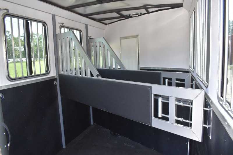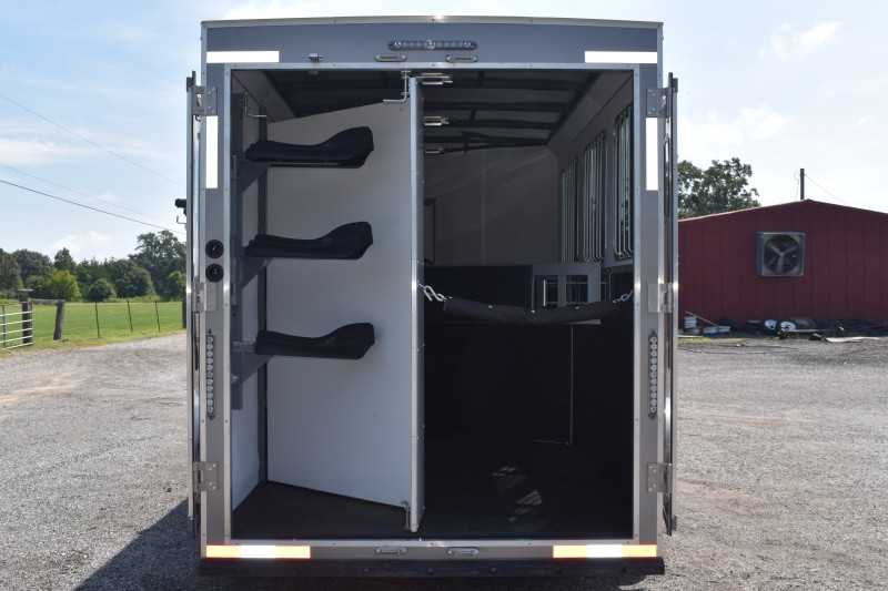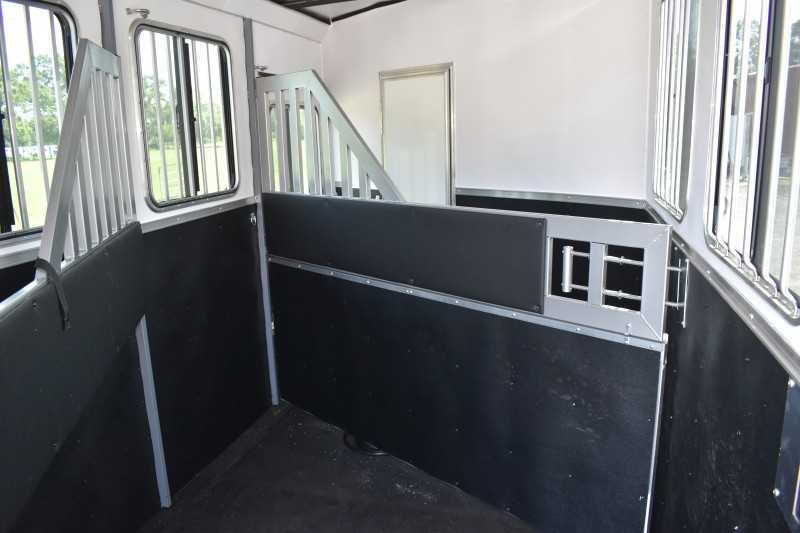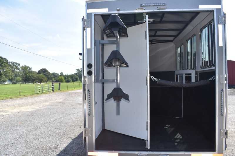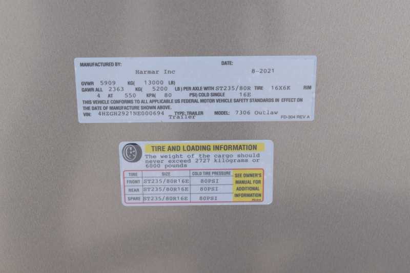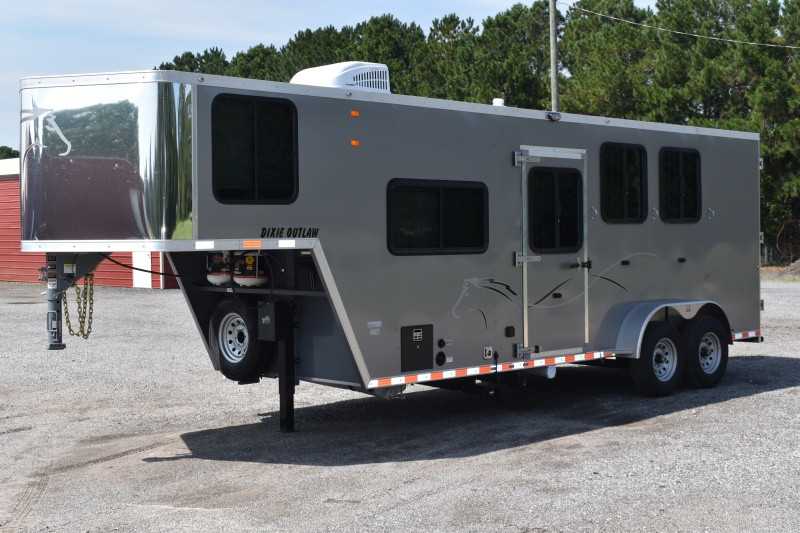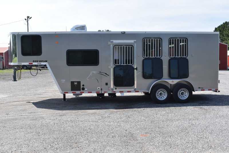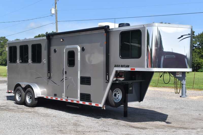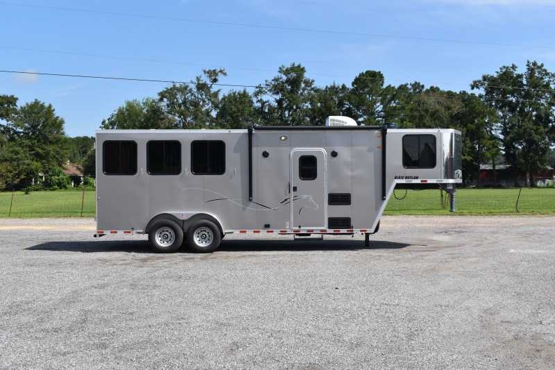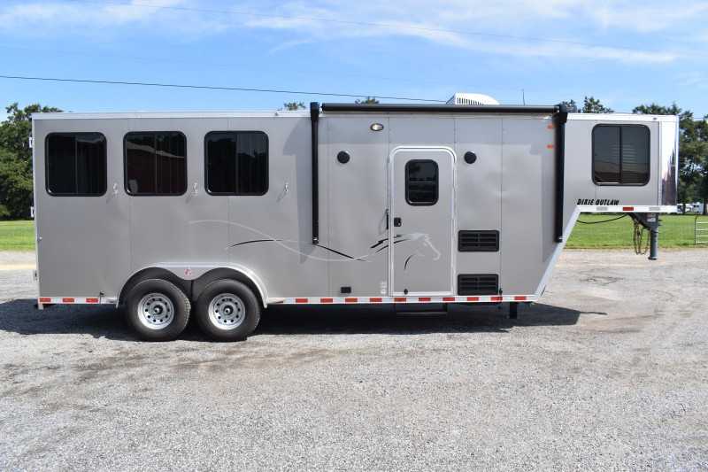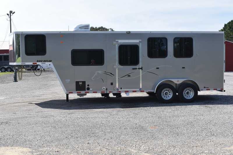 2022 Harmar Dixie Outlaw 7306LQ, 3 horse trailer, ELECTRIC AWN! HYD JACK! LIFETIME FLOOR! Living Quarters 6' Shortwall 11' Longwall Walk-thru Door Kitchen Refrigerator Microwave Living Area A/C Bathroom Toilet Shower Plumbing Fresh Water Gray Water Holding Black Water Holding Water Heater Power LP Tank(s) Battery Wired for 110v power Horse Area 3 Horse Escape Door Trailer Steel Frame/Aluminum Skin Hydraulic Jack Spare Tire Lifetime Pressure Treated Wood Floor 7000# Axles 16-inch Tires Electric Awning Dimensions & Weights Dimensions & Weights are approximate Outside Width: 7' Inside Height: 7' (21 hands) Box Length: 20' Empty Weight: 6800 lbs. GVWR: 13000 lbs.