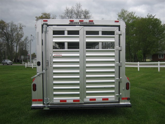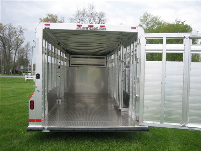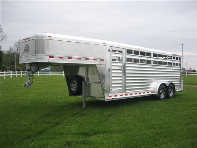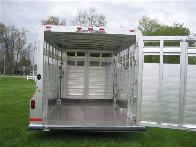 2016 Elite 7'x6'6x20' stock trailer, Gooseneck, This 7'Wx 6'6"Tx 20'L all aluminum trailer has a spare tire, rubber bumper, escape door, LED lights and a 1/2 slide center gate.