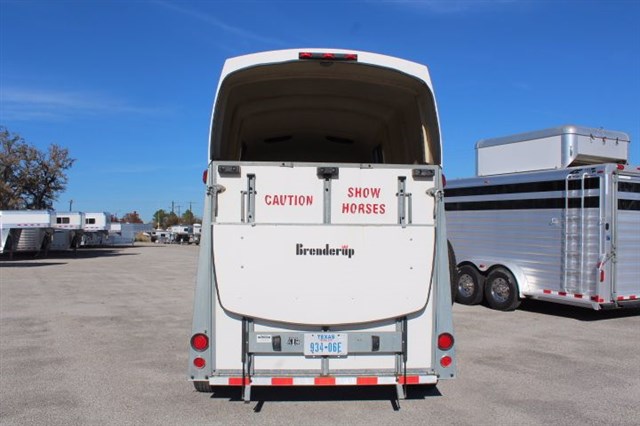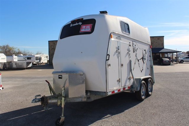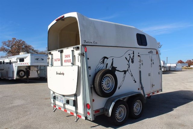 2010 Brenderup BARON LC 2 horse trailer, straight load with ramp, 16'3" length X 7'4" tall X 6'6" width, tack room, spare tire. Super lightweight fiberglass trailer, with inertia brakes, independent torsion axles (shock absorbers) and unique built in brake system allows it to tow smoothly with almost any vehicle! No rust!!! Great for coastal living and two lane roads. Six chest and butt-bar adjustment options accommodate ponies to horses, up to 18 hands. Tack room converts to 3' dressing room by raising hinged tack compartment lid. Includes four bridle hooks, two custom saddle racks, spare tire. Horses love front window and openness of trailer- ventilates extremely well, even in the hottest conditions. Specs: Total Height 9'2"; Total Width 7'1", Total Length 16'3", Interior Height 7'4", Stall length 12' 5", Stall width 2 @ 32" adjustable.