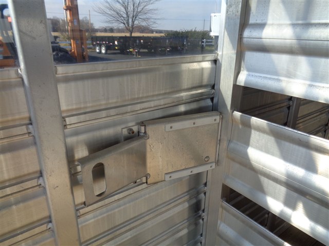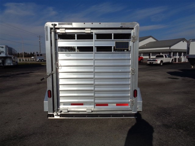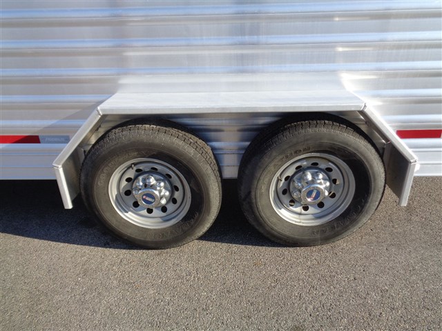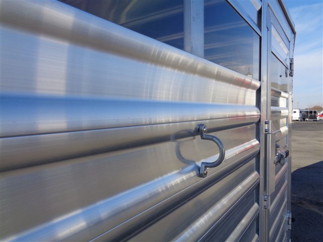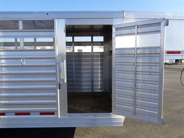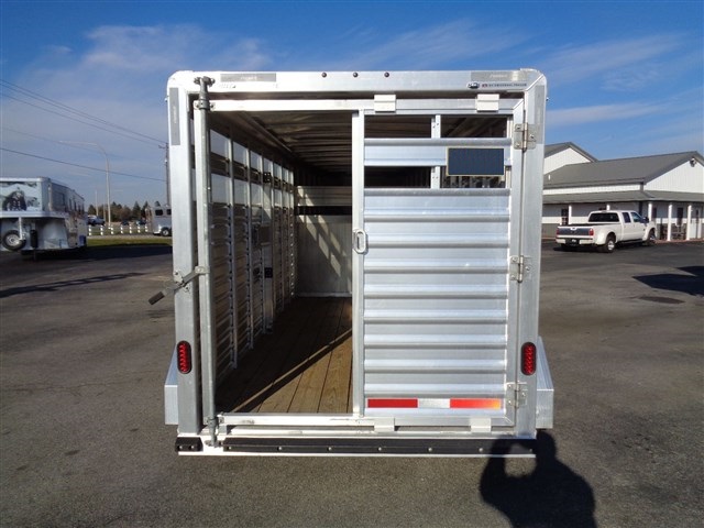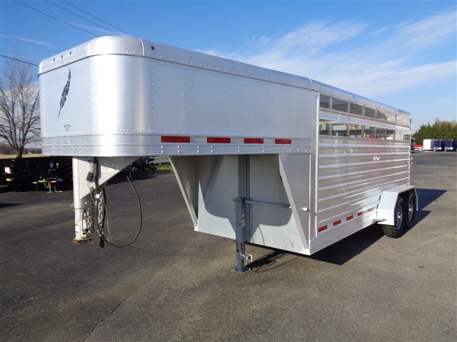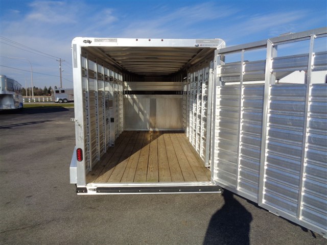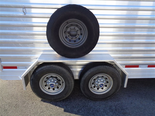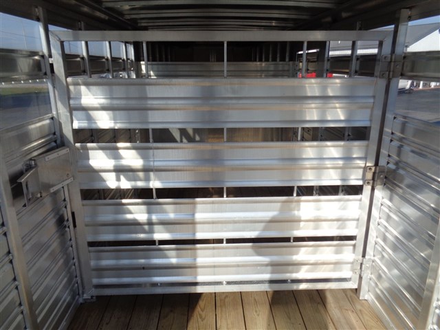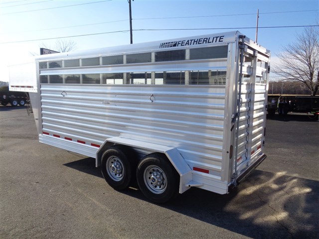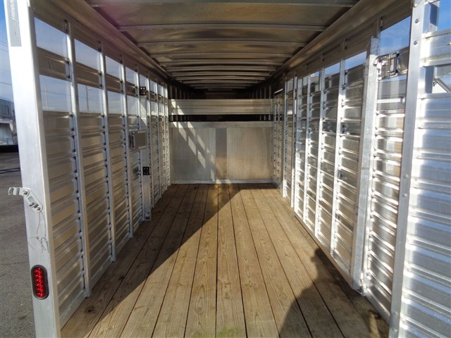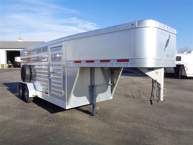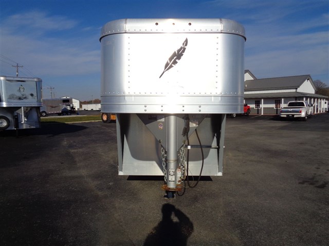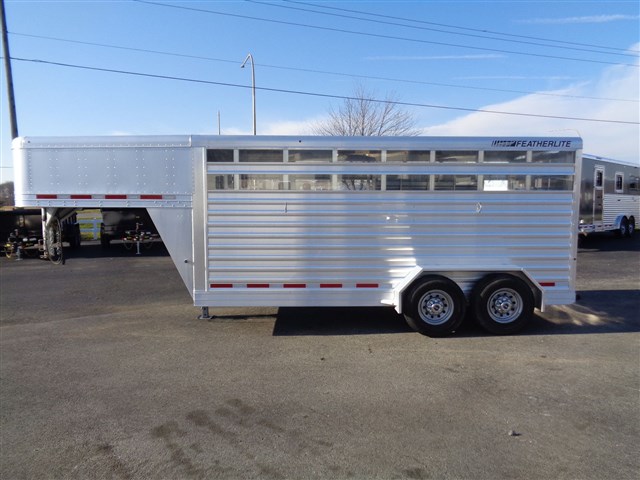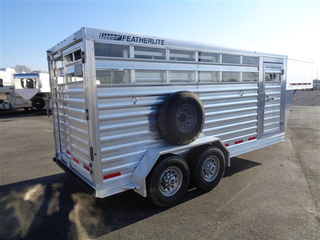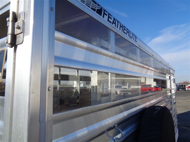 2014 Featherlite model 8117 aluminum gooseneck livestock trailer. This very well kept trailer is 6'7" wide, 7' tall, and 16' long on the floor. It features 16" Goodyear radial tires, spare tire with cover, escape door, removable lexan enclosures, slide/swing rear gate, cut gate, and interior light.