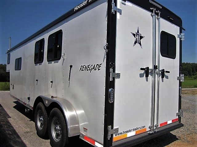 2017 Hoosier Renegade 7208, This trailer is fully equipped and ready to hit the road. 7' Wide, 7'6 Tall, 22" Long, and 7500 lbs. Two horse slant load w/roof vents, drops on the head, collapsible rear tack, saddle rack & blanket bars, bridle hooks, LED lights, rear load lights, two 20# LP tank, dual deep cycle batteries, spare tire, exterior water faucet, lined & insulated walls. The living quarters is 7' w sofa sleeper, insulated floor, microwave oven, kitchen sink, vent hood above a two-burner cooktop, shower, toilet, closet at entry door, walk-thru door to the horse area, AM/FM/CD/AUX/USB Radio w/outdoor speakers, awning, heat & air, pocket door for bath, privacy window shades and T.V. antenna. This is a remarkable trailer for the money and comes with full warranty. 7'6" Height White Exterior Skin 6K Rubber Torsion Axles LT 235/85R16 Single Speed Drop Leg Jack LED Exterior Lighting (1) LED Load Lamp at Rear (1) 20# LP Tank (1) Deep Cycle Battery Keyed Hasp Locks On Horse Area Doors 1st Stall Access Door (N/A On 7208/7210) (1) Drop Down Feed Door, W/ Bars, Per Horse Lined & Insulated Side Walls In Horse Area Wood Floor W/ 3'4" Rubber Mats In Horse Area Scorpion Lined Walls In Horse Area (1) Inside Tie Ring Per Horse (2) Outside Tie Rings Per Horse (1) Bridle Hook Bar & (1) Brush Tray Stationery Saddle Rack W/ (1) Rack Per Horse Converter Kitchen Sink & Microwave Oven Refrigerator (3cf-8',6cf-10') Sofa Pleated Window Shades& Window Valences Insulated Floor (R11) Pocket Door Pre-Frame & Wire For Air Conditioner 35 Gallon Fresh Water Tank & Hot Water Heater Shower & Toilet.