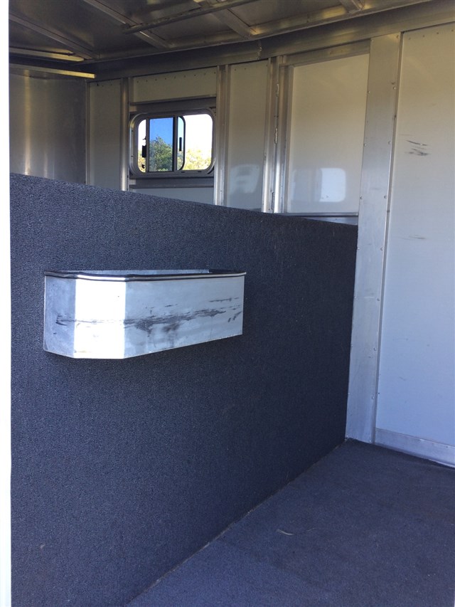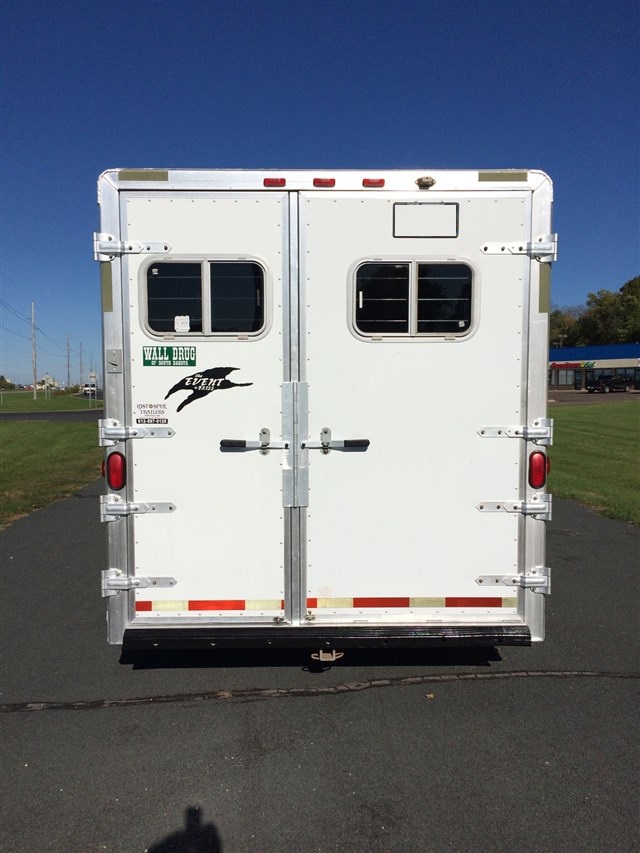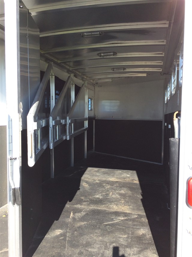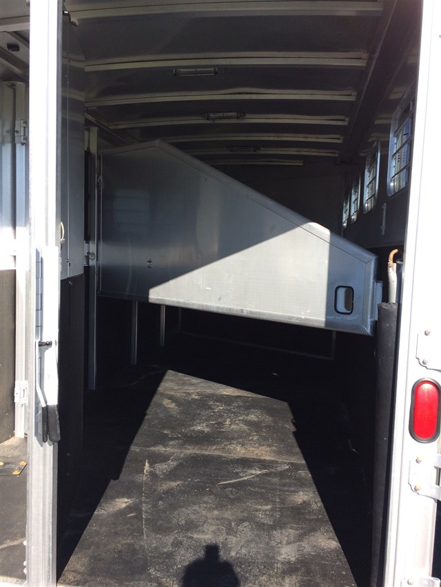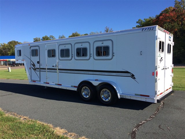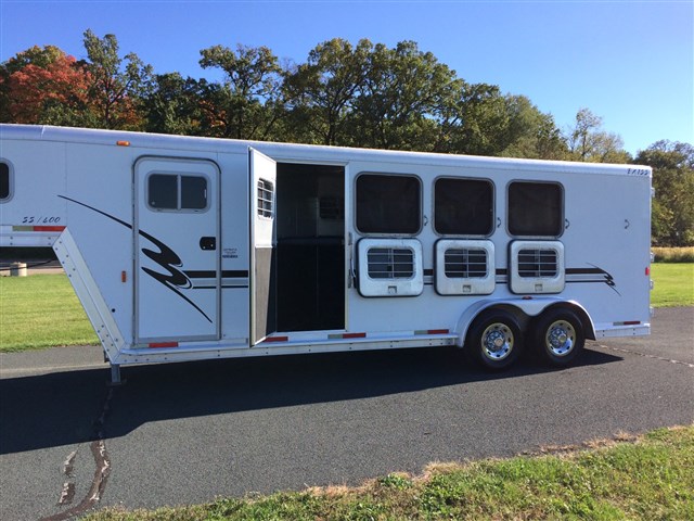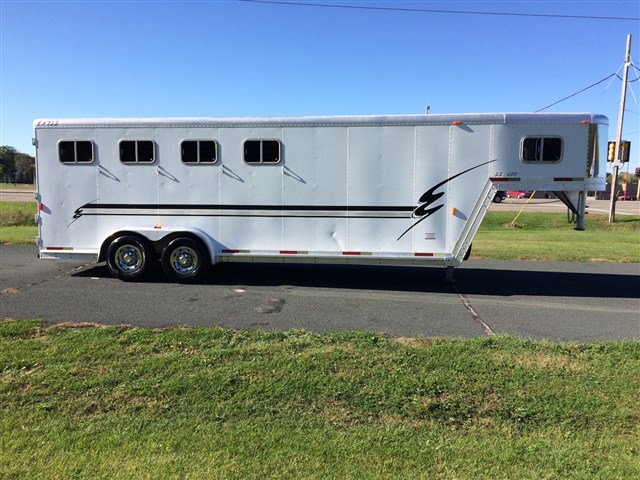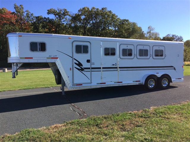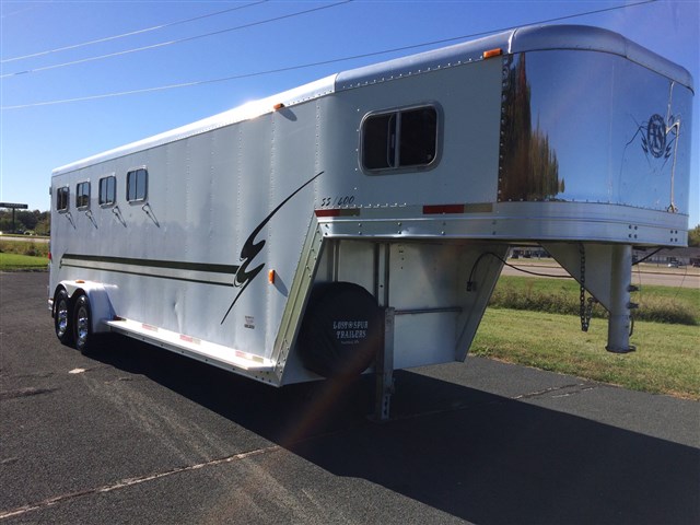 2000 Exiss SS 400 4 horse slant gooseneck, 7'ft wide, 7'ft tall, 21.6'ft on the floor length, stainless steel nose, 4'6" shortwall in dress(8'ft long side wall, 4 tier saddle rack, blanket bar, bridle hooks, Escape door in 1st stall, drop down feed doors head side, Professional Choice snap in screens, sliding windows tailside, 2 way pop-up roof vents, fold-up rear tack w/ removable saddle rack,7000# torsion axles, 16" 235-80-R16 10ply tires, spare tire, Floor is like New!!! Rubber floor & Wall mat's.