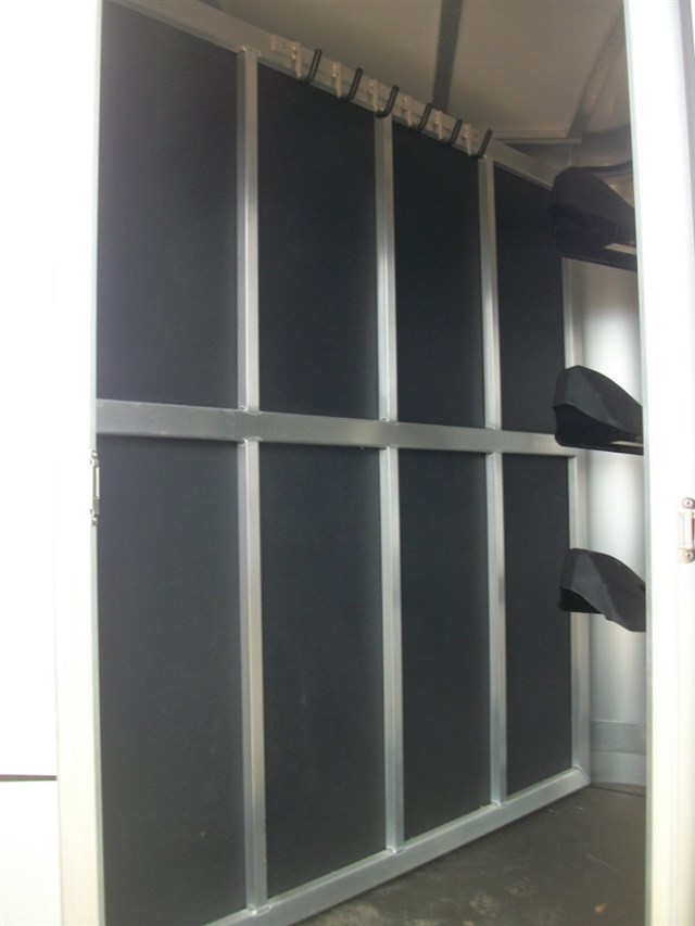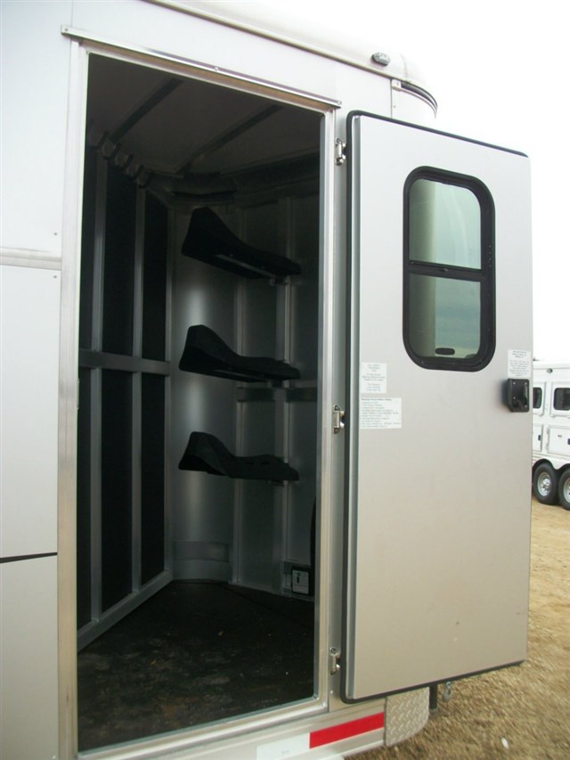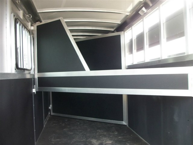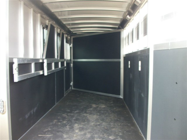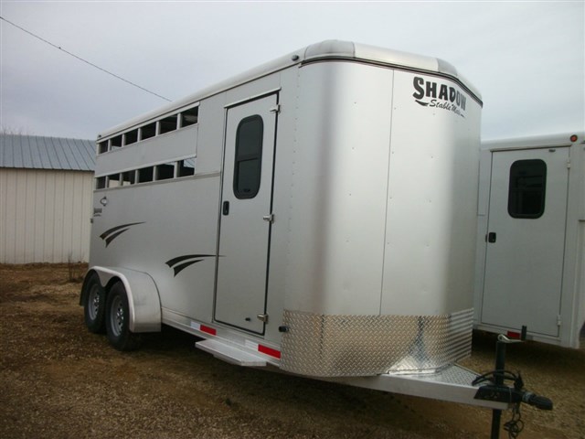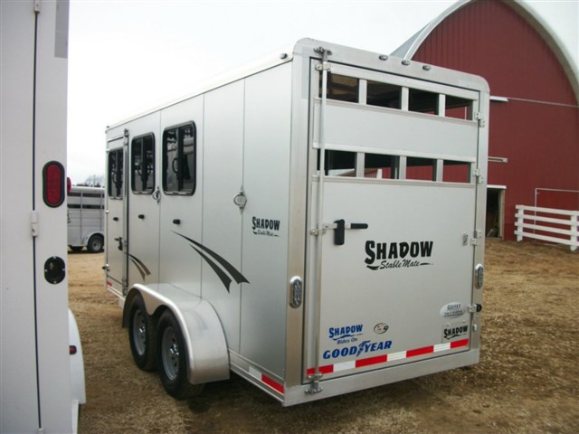 2014 Shadow 3 horse trailer bp - Aluminum. 7'3" tall, 6'wide, 17'long..ALUMINUM SHADOW TRAILER.. Slant load with 1st horse escape door, single rear door with vents, LED lights, wood floor with rubber mats, dressing room wall is a swing wall, lined walls. Dressing room has saddle racks, bridle hooks.. V-nose trailer with 7 way plug and 2 5/16" coupler.