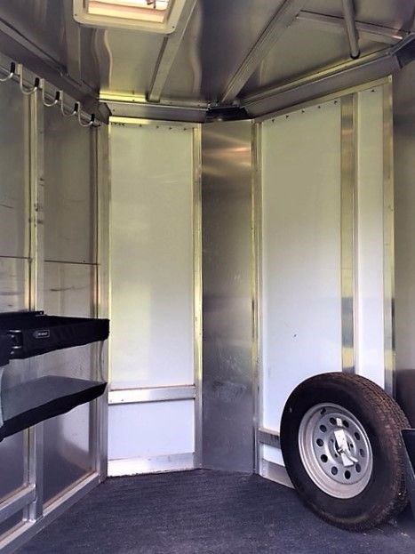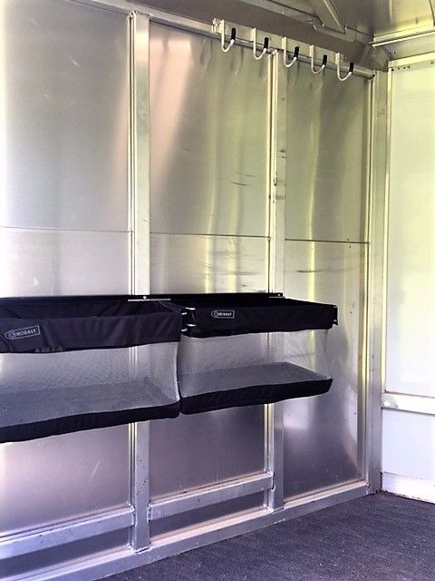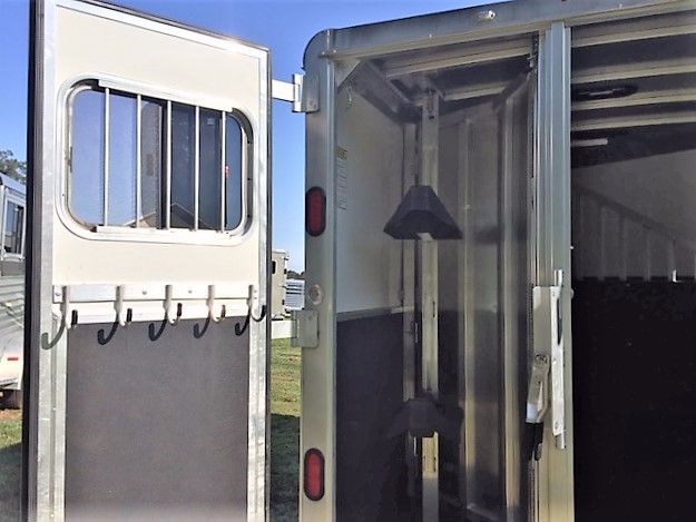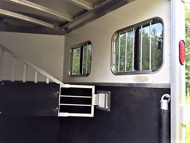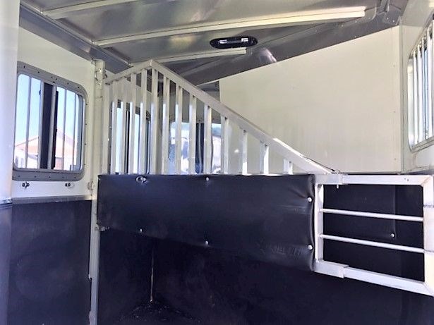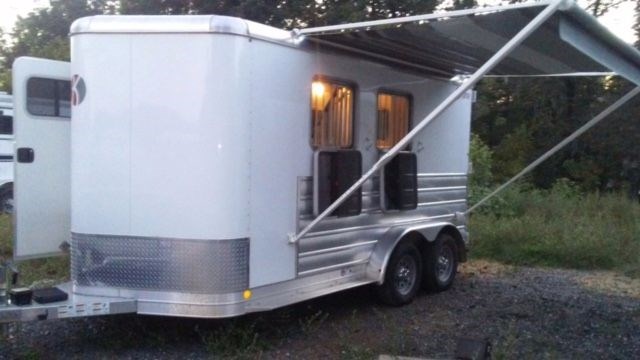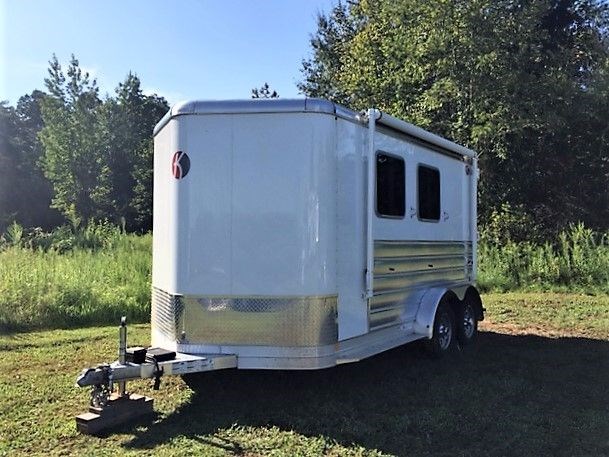 2015 Kiefer Genesis, 2 Horse trailer, Slant Load, Bumper Pull All aluminum construction White exterior with extrusions 7' Wide, 7' Tall, 12'7 Long LARGE AWNING Torsion axles with all wheel electric brakes 15" Tires with full size spare Full length running boards 60/40 Rear doors with windows Collapsible rear tack with saddle rack on movable post Drop windows with bars on the head Sliders on the butt Pop-up roof vents Padded divider with airflow bars & holdback Padded butt bar Heavy duty rubber floor mats in horse area 2' Shortwall carpeted dressing room with screen door & window Bridle hooks, brush tray, clothes rod Crank vent Braced for A/C Inside & outside horse ties