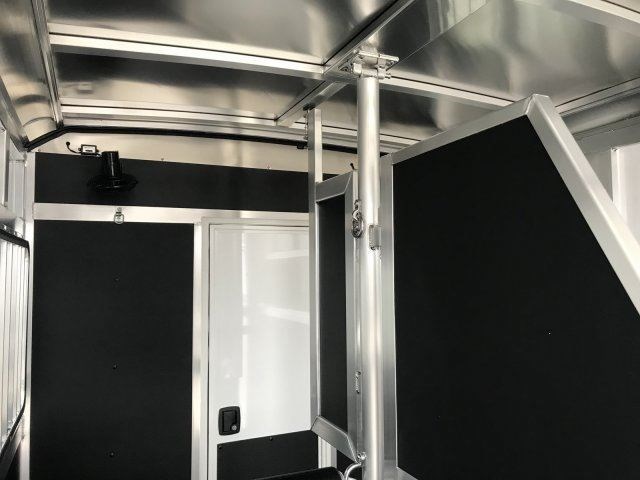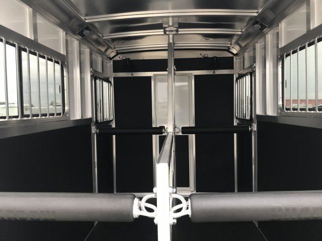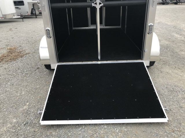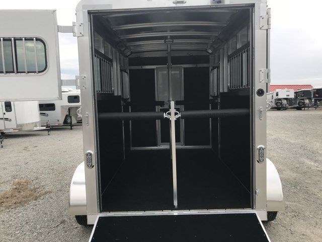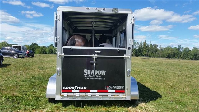 Americas Choice for an All-Aluminum Horse Trailer Pull with most any SUV or small truck 15' Floor Length, 17' OAL, 7'6" Tall, 6'4" Wide Largest Stalls in its class 42" wide 3500# Tandem Leaf Spring Axles for the smoothest ride Dressing room offers removable saddle racks Aluminum Roof Pressure Treated Wood Floor (20-year warranty) with heavy rubber mats (alum floor available) 54' Length Dressing Room, Fixed Straight Wall, 2 Saddle Rack Mounts Spring Assisted Rear Ramp with Removable dividers Shadow rubber scratch resistant material on walls and head wall so easy to clean! Automatic Latch Dividers (latch and unlatch every time with ease!) Shadow Custom Dividers no sharp edges Interior Horse Lights, 2 Horse Ties per Stall Outside Horse Ties, One Key locking system! L.E.D. lights which are 10 times brighter and uses 90% less power than traditional lights Aluminum Interlocking double tongue and groove construction Good Year 15" tires , Spare Included Electric Brakes on all 4 wheels, Break A Way battery box.