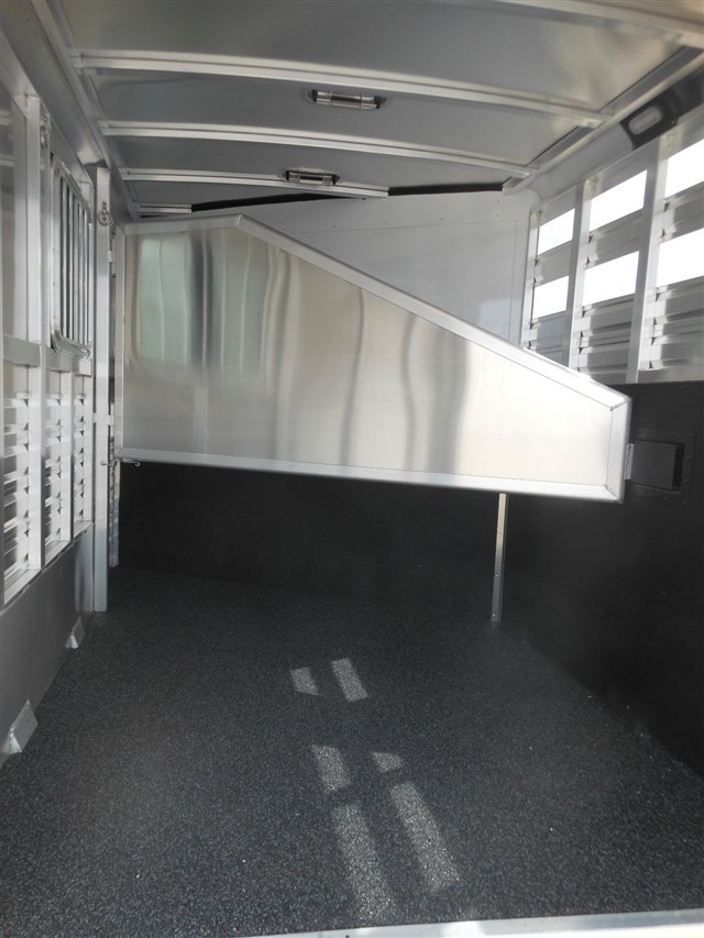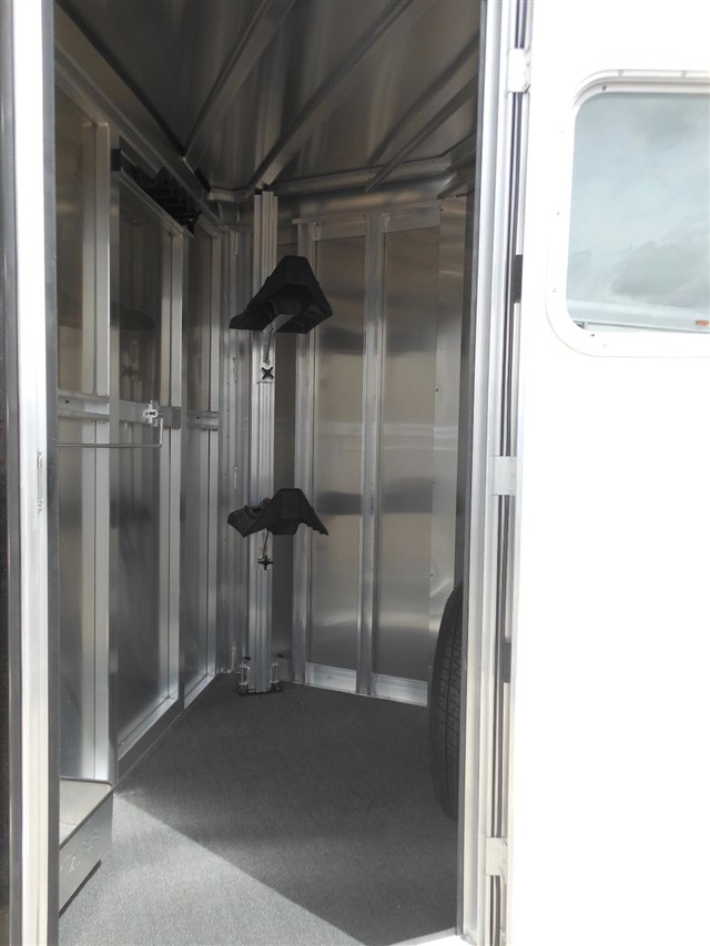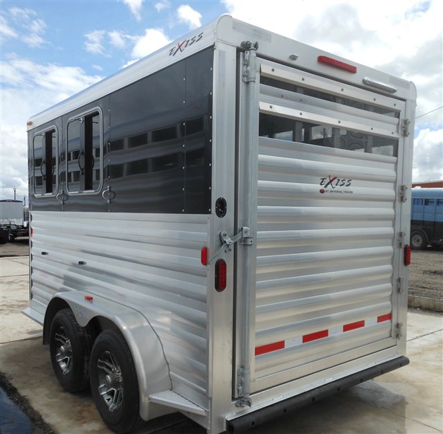 2017 Exiss CXF 2 horse trailer. Trailer Width: 6'8" Horse Stalls 2 or 3 Horse Stall Width 40" Inside Height 7'2" Exterior Sides Extruded Aluminum Rear Doors Single swing gate with cam lock latch Windows Large Drop Down Feed Doors, one per horse. Curbside air gaps. Tack Area 220 square feet Axles (2) 3,500 lb. rubber torsion axles with electric brakes Landing Gear 5,000 lb top wind jack w/ wheel Stall Dividers Slant stall divider w/ body, shoulder and head separator and (patented) slam latch system Tie Rings 2 inside tie ring per horse; 2 exterior tie rings per horse Warranty 8/3 Roof: Single piece aluminum roof Floor: interlocking extruded aluminum plant floor system w/ 2" X 4" I-beams Wheels: Five 15" 6 hole natural aluminum wheels w/ 8 ply tires Dressing Room Wall: Solid roof to floor wall separating dressing room from horse area Hitch Safety: Aluminum V-Hitch with 2 5/16" coupler, breakaway switch with battery, and safety chains with slip hooks Gravel Guard: Treadplate gravel guard on nose Doors: Camper door with access to tack room Horse Area Walls: curbside wall is lined and insulated up to 48" Roof Vents: One roof vent per stall