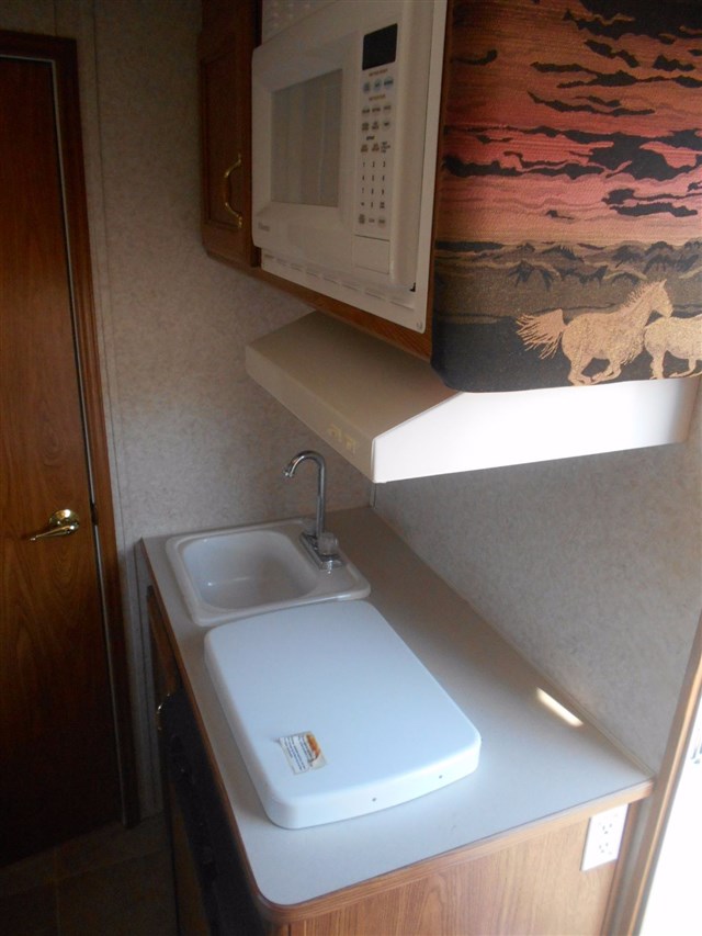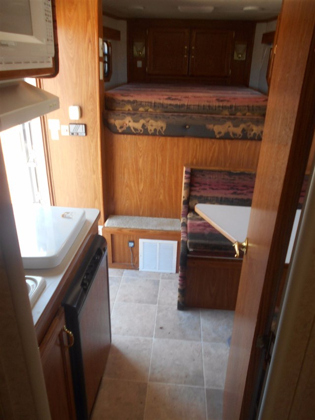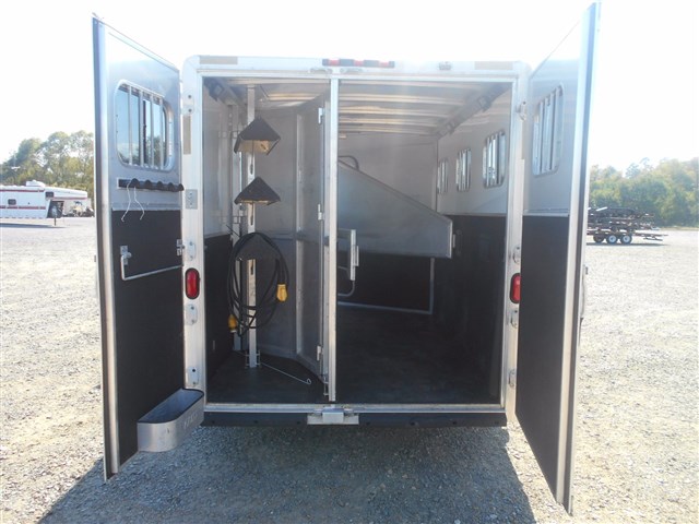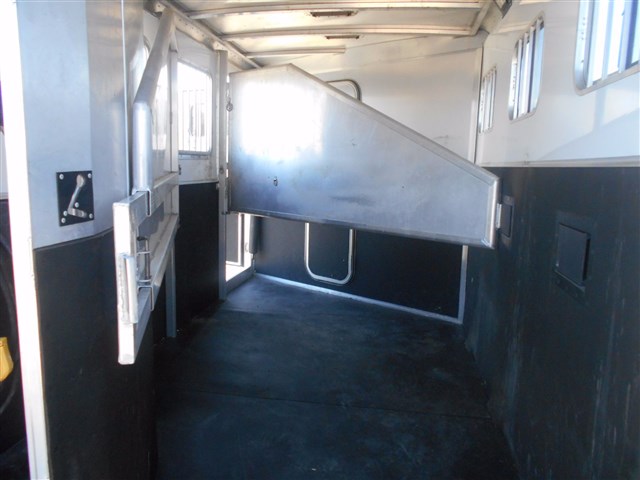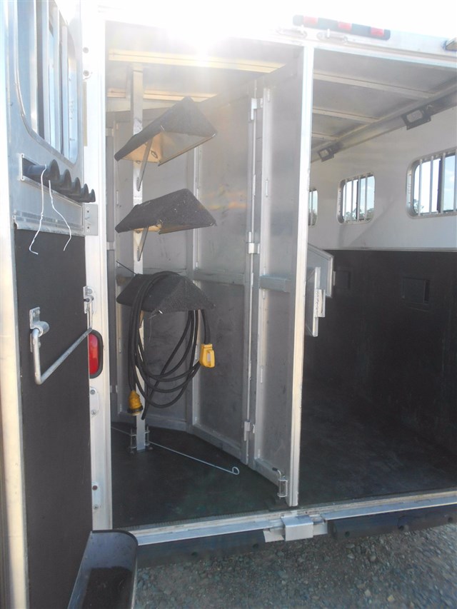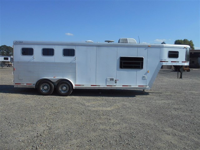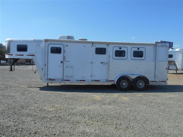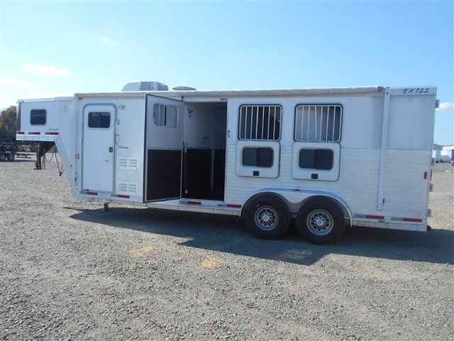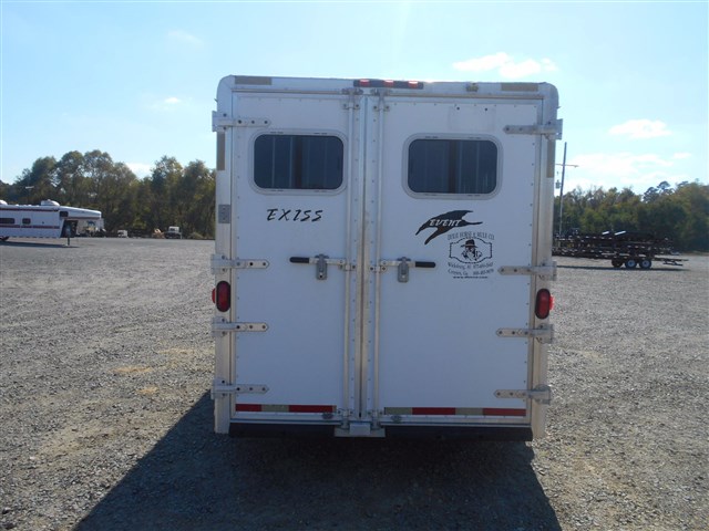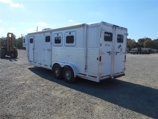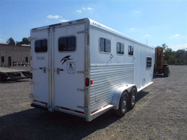 2004 EXISS 3 HORSE WITH 8' LIVING QUARTERS. 7' wide, 7' tall, drops on head side, bus windows on butt, awning, collapsible rear tack, polished nose, escape door, slates on horse area, 60/40 rear doors, pass thru door, ref, microwave, cook top, sink, A/C and shower.