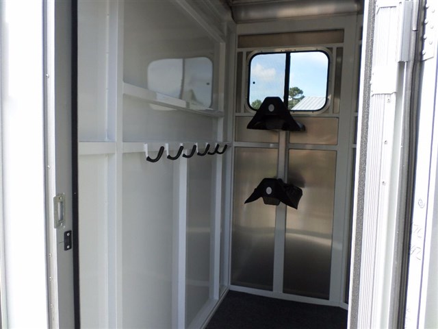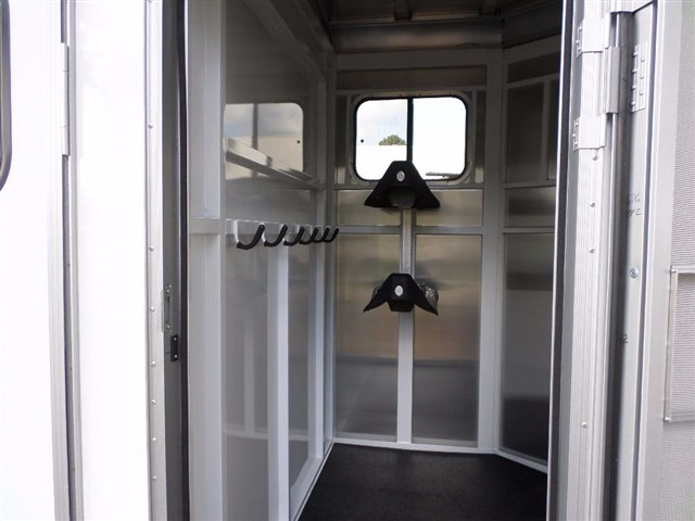 2017 Adam 2 Horse Straight Load 710A-DR, 14x6x7'6", 2 3500# Torsion Axles with Brakes, 15" 8 Ply Radial Tires & Spare, Poly Lined Walls in Horse Area, Treated Floor with Heavy Duty Mats, 7' Stall Length and 3' Head Room, Partial Divider Padded, Head Divider, Two Bus Windows with Bars and Screens, 2 Escape Doors with Windows & Aluminum Hinges, Tail and Breast Bars Padded, Rear Spring Loaded Ramp with Tail Curtains with Windows, Load Light on Rear, All New LED Lights, Dome Light, Aluminum Roof Vent for Each Horse, Break Away Kit, Rock Guard on Front, Standard Clearance Lights, 4' V Nose Dressing Room/Tack Carpeted with 2 Saddle Racks and Bridle Hooks.