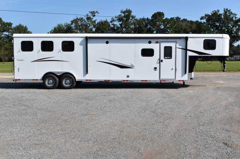 2022 Bison Ricochet 8313GBSO, ELECTRIC AWN! HYD JACK! LIFETIME FLOOR! Living Quarters Glideout 13' Shortwall 18' Longwall Walk-thru Door Kitchen Refrigerator Cooktop Microwave Living Area Sofa A/C Furnace Radio Antenna Bathroom Bathroom Sink Toilet Shower Plumbing Fresh Water Gray Water Holding Black Water Holding Water Heater Power LP Tank(s) Battery Wired for 110v power Horse Area 3 Horse Escape Door Mangers Trailer Steel Frame/Aluminum Skin Hydraulic Jack Spare Tire Lifetime Pressure Treated Wood Floor 7000# Axles 16-inch Tires Electric Awning Dimensions & Weights Dimensions & Weights are approximate Outside Width: 8' Inside Height: 7'6 (22.5 hands) Box Length: 27' Empty Weight: 10733 lbs. GVWR: 17588 lbs.