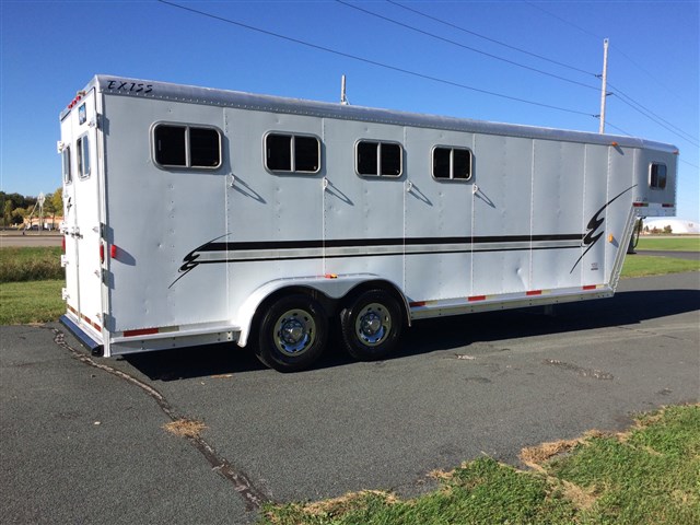 2000 Exiss SS 400 4 horse slant gooseneck, 7'ft wide, 7'ft tall, 21.6'ft on the floor length, stainless steel nose, 4'6" shortwall in dress(8'ft long side wall, 4 tier saddle rack, blanket bar, bridle hooks, Escape door in 1st stall, drop down feed doors head side, Professional Choice snap in screens, sliding windows tailside, 2 way pop-up roof vents, fold-up rear tack w/ removable saddle rack,7000# torsion axles, 16" 235-80-R16 10ply tires, spare tire, Floor is like New!!! Rubber floor & Wall mat's.