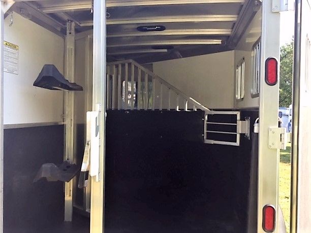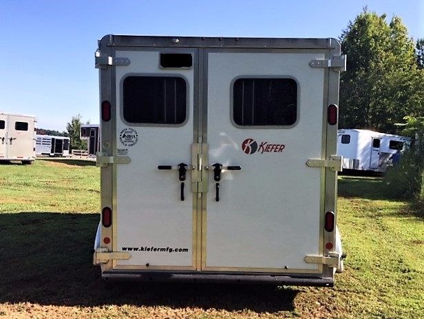 2015 Kiefer Genesis, 2 Horse trailer, Slant Load, Bumper Pull All aluminum construction White exterior with extrusions 7' Wide, 7' Tall, 12'7 Long LARGE AWNING Torsion axles with all wheel electric brakes 15" Tires with full size spare Full length running boards 60/40 Rear doors with windows Collapsible rear tack with saddle rack on movable post Drop windows with bars on the head Sliders on the butt Pop-up roof vents Padded divider with airflow bars & holdback Padded butt bar Heavy duty rubber floor mats in horse area 2' Shortwall carpeted dressing room with screen door & window Bridle hooks, brush tray, clothes rod Crank vent Braced for A/C Inside & outside horse ties