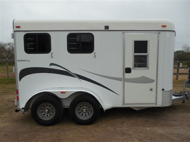 2004 2H Kiefer Built Eagle XLA For Sale. 2 Horse slant load with rear tack and dressing room, Tires and spare, Brake and electric work done, Recently cleaned and acid washed, HORSE AREA Approximate interior measurements: 7' tall, 6'4" straight width, 6'8" along the back wall, 10'10" along front wall, 7'11" along slant wall, Rubber mats on floor, Kick and paw mats on front and back walls, Padded dividers, no rips or tears in any of the padding!, Escape door in first stall, Drop-down windows at horses' heads, Drop-down bars at horses' heads, Sliding bus windows with fixed bars at horses' rear and back doors, Two roof vents in horse compartments, Lights in rear tack and at front left corner of horse compartment. Rear tack light works; front light does not but may just need a bulb replaced since other lights all work., Removable rear tack, Bridle hooks on door of rear tack, Saddle rack can be move to rear tack DRESSING ROOM, Screen door, Large roof vent, Blanket bar, Saddle rack (two saddles), Four bridle hooks, Working light, Carpeted This is a fantastic little trailer that hauls and maneuvers well.